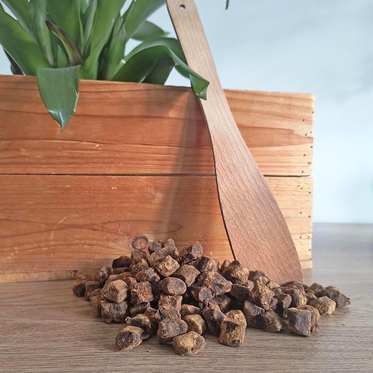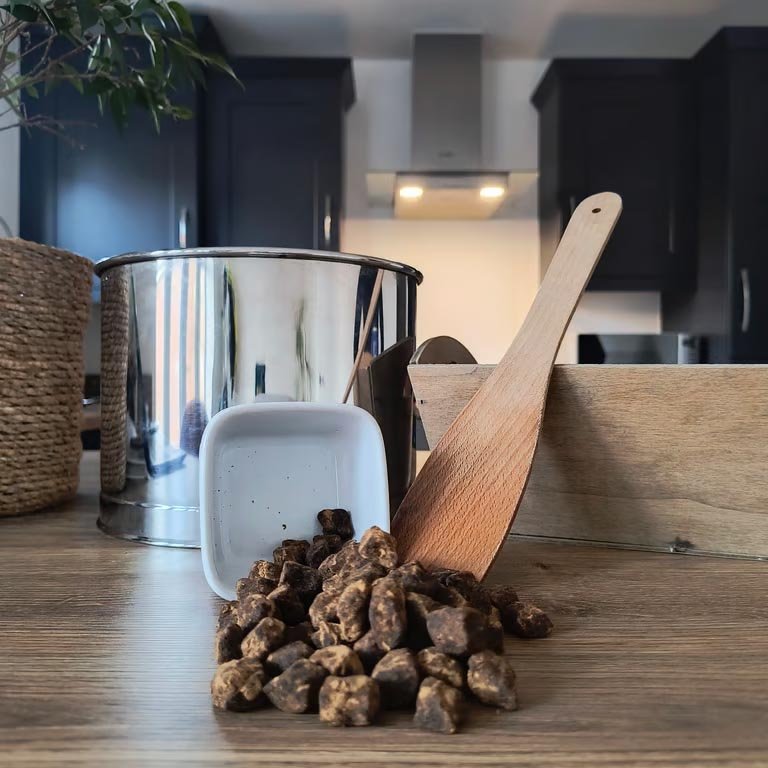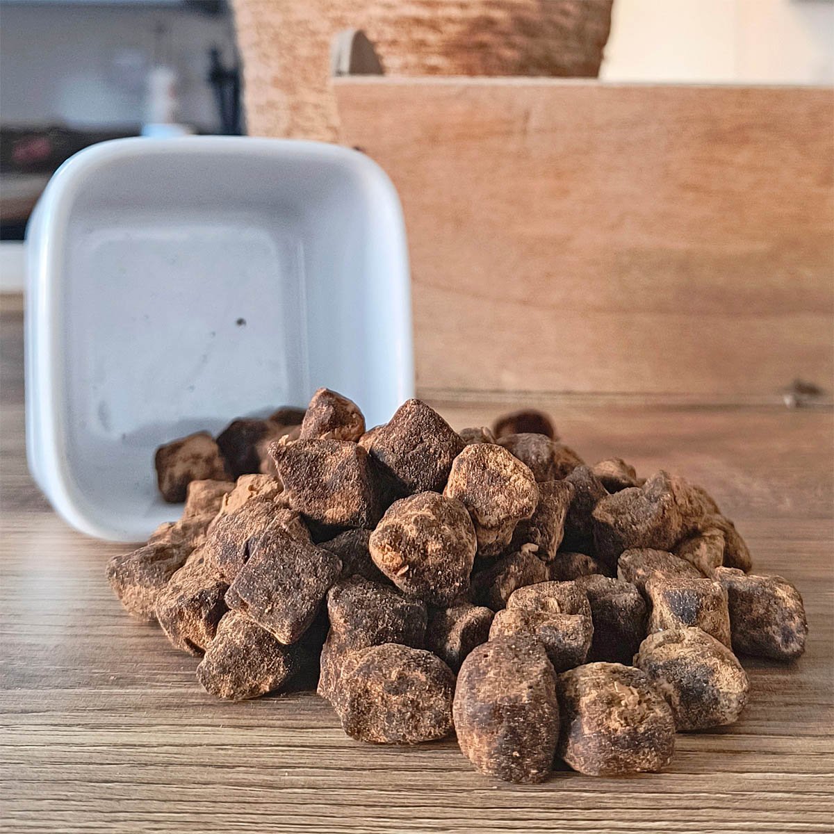 Appearance: Irregularly shaped cubes with the presence of light brown powder on the outside